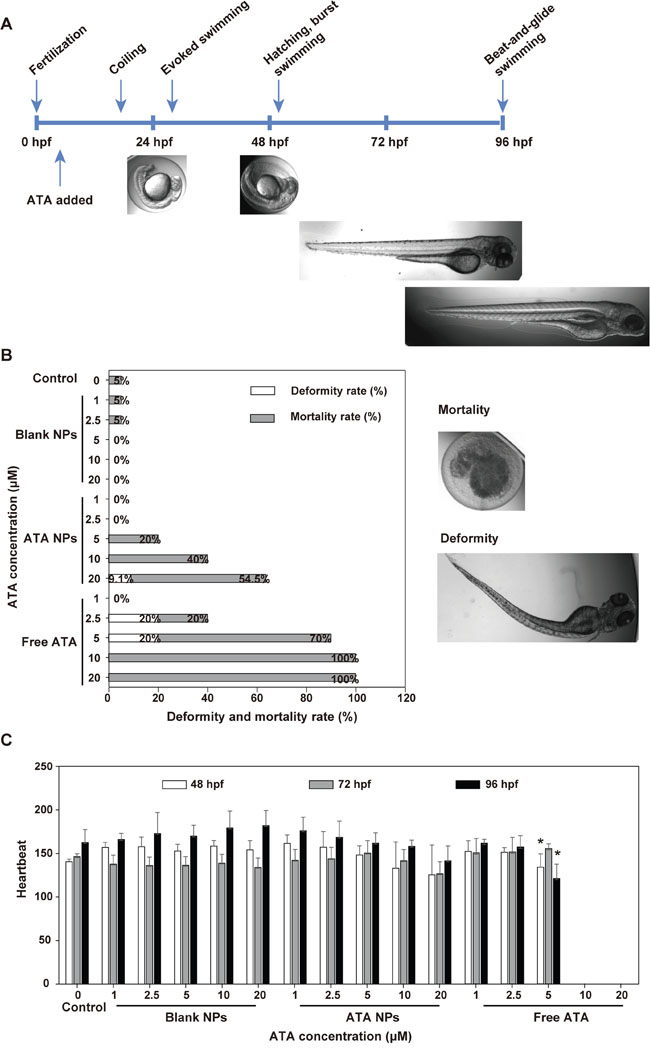 Various concentrations of free ATA and ATA NPs were added. The temperature of incubator was maintained at 28.5°C to ensure the optimal development of the embryos. Throughout the experiment, incubation solutions with freshly added ATA were replaced daily. Images of the zebrafish were captured in order to document any morphological changes. The heart rate was also recorded as described previously [44–47]. Twenty zebrafish were used in each experimental group and the zebrafish experiments were conducted at least four times.