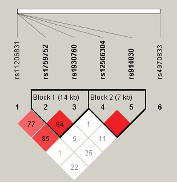 Figure 1: Haplotype block map for all the SNPs of the PPAP2B gene.