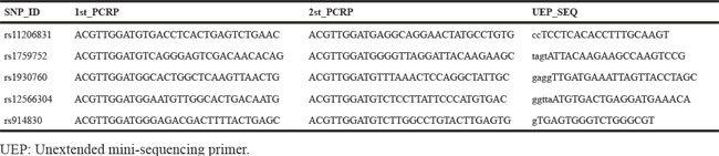 Candidate PPAP2B SNPs were selected from previous publications that associated polymorphisms with CHD [20, 21]. SNPs with minor allele frequencies (MAF) > 5% in the HapMap CHB population were selected. We validated five SNPs in PPAP2B. A GoldMag-Mini Purification Kit (GoldMag Co. Ltd. Xian city, China) was used to extract genomic DNA from whole blood samples. DNA concentrations were measured using a DU530 UV/VIS spectrophotometer (Beckman Instruments, Fullerton, CA, USA). Using MassARRAY Assay Design 3.0 software (Sequenom, San Diego, CA, USA), we designed a multiplexed SNP MassEXTENDED assay [22]. SNPs were genotyped using the standard protocol recommended by the MassARRAY RS1000 (Sequenom) manufacturer, and data were analyzed using Typer 4.0 Software (Sequenom). The primers used for this study were listed in Table 7.