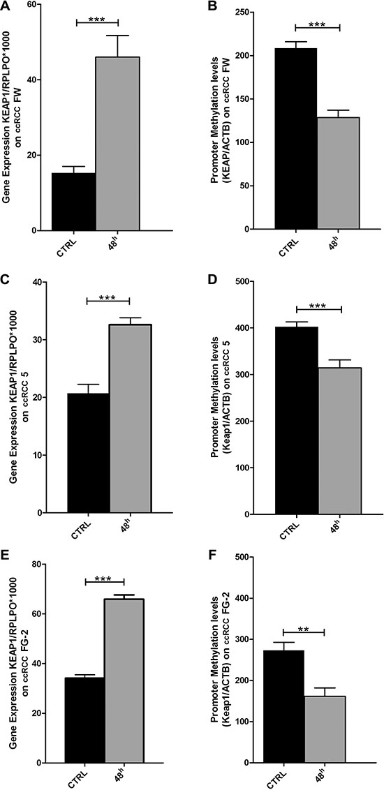 Figure 4: Changes in KEAP1 mRNA transcript levels in the (A) ccRCC-FW, (C) ccRCC 5, (E) ccRCC FG-2 cell lines by quantitative real-time RT-PCR before (CTRL) and after treatment with 5 μm of 5-azacytidine at 48 hours (AZA 48 h). Error bars indicate the standard deviation of three different experiments. Changes in KEAP1 promoter methylation levels in the (B) ccRCC FW, (D) ccRCC 5, (F) ccRCC FG-2 cell lines by quantitative methylation real-time PCR before (CTRL) and after treatment with 5 μm of 5-azacytidine at 48 hours (AZA 48 h). Error bars indicate the standard deviation of three different experiments. **p < 0.01, ***p < 0.001.