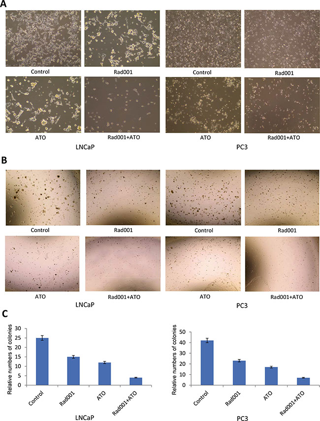 The combination of ATO and Rad001 can synergize prostate cancer LNCaP and PC3 cells morphologic alterations, compared with alone treatment (Figure 2A). The colony formation ability in prostate cancer LNCaP and PC3 cells treated with two compounds was significant inhibited at the 14th day, compared with one compound treatment (Figure 2B), suggesting the prostate cancer cells tumorigenesis may be synergistically inhibited with the combination of ATO and Rad001 treatment. The quantification of colony formation is shown in Figure 2C.