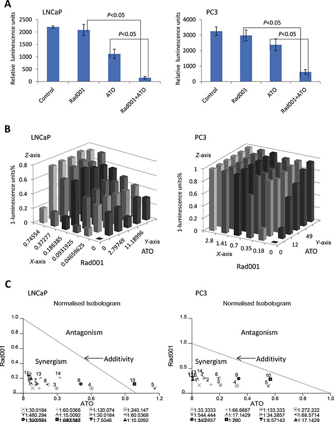 To confirm that Rad001 and ATO can work synergistically to reduce the cell luminescence units, we added each of the two compounds at either gradient concentrations, and detected their effects on the luminescence units of LNCaP and PC3 cells. The Figure 3B showed that the dose-dependent luminescence units of prostate LNCaP and PC3 cells were detected, when the cells were administered with ATO or Rad001 alone. The ATO ED50 of LNCaP cell lines was 22.38 μM, and the ED50 for Rad001 was 0.75 μM. For PC3 cells, the ED50 for ATO and Rad001 were 24.45 μM and 0.70 μM, respectively. However, for both PC3 and LNCaP prostate cancer cell lines, the combination of ATO and Rad001 treatment resulted in more reduction of cell luminescent units (Z-axis), compared with either ATO or Rad001 alone treatment (Figure 3B). There was the significant synergism of the combination of ATO and Rad001, according to the combination index (CI) determined with the CalcuSyn program (Figure 3C). When the LNCaP cells were treated with 0.37 μM Rad001, the cell luminescence units reduced to 13.62%; and 11.19 μM ATO treatment alone induced 32.23% reduction in cell luminescence units. However, the reduction of cell luminescence units increased to 68.29% (CI = 0.76) when treatment with two compounds. On the other hand, when the PC3 cells were treated with 0.18 μM Rad001, the cell luminescence units reduced to 15.67%; and 6 μM ATO treatment alone induced 18.67% reduction in cell luminescence units. However, the reduction of cell luminescence units increased to 78.12% (CI = 0.57) when treatment with two compounds.