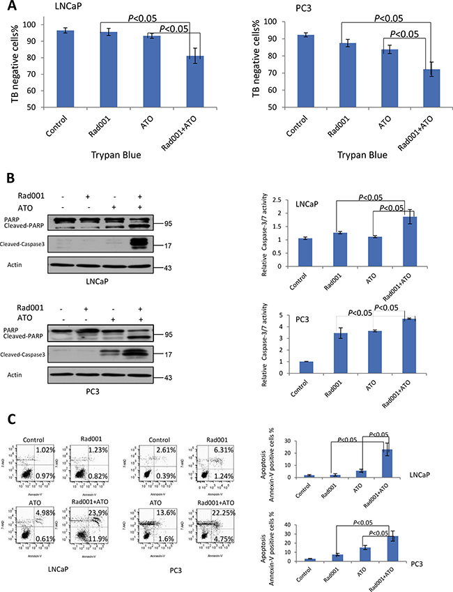 Figure 4: Rad001 and ATO combination synergistically induced cell death in prostate cancer cells. For LNCaP cells, they were treated DMSO (control), Rad001 (0.37 μM), ATO (11.19 μM), and their combination, for 24 hrs. For PC3 cells, they were treated DMSO (control), Rad001 (0.35 μM), ATO (12.00 μM), and their combination, for 24 hrs. (A) Trypan blue (TB) analysis of the LNCaP and PC3 cells treated alone or in combination group. Two drugs resulted in more reduction of the cell viability than single treat. Two-way T-test results P < 0.05 between the two groups. (B) Increased levels of cleaved Caspase-3/PARP were detected in LNCaP and PC3 cells with 24 hrs of Rad001 and ATO. What’s more, higher activities of Caspase-3/7 were observed in LNCaP and PC3 cells with 24 hrs treatment of Rad001 and ATO combination (P < 0.05 between the two groups). (C) Flow cytometry analysis of apoptosis with Annexin-V and 7-AAD staining. Right (top and bottom) is Annexin-V positive cells. A significant increase of percentage of apoptotic cell was observed with Rad001 and ATO combination treatment (P < 0.05).