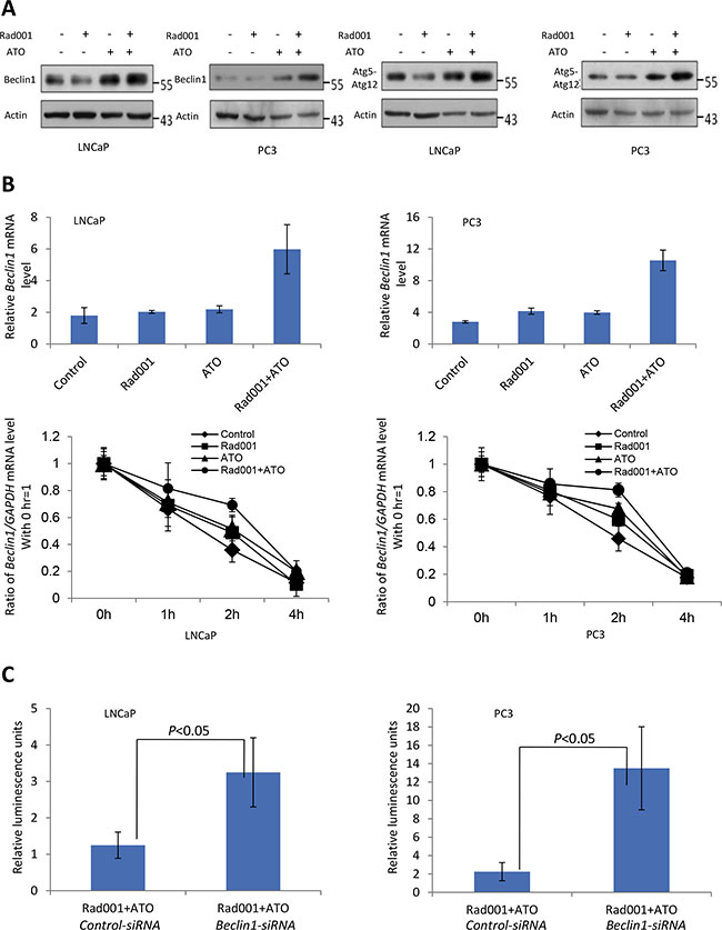 Figure 6: Regulation of autophagy proteins in response to combination of Rad001 and ATO. For LNCaP cells, they were treated DMSO (control), Rad001 (0.37 μM), ATO (11.19 μM), and their combination, for 24 hrs. For PC3 cells, they were treated DMSO (control), Rad001 (0.35 μM), ATO (12.00 μM), and their combination, for 24 hrs. (A) Atg5-12 conjugates and Beclin1 were induced in response to the treatment of two compounds. (B) Beclin 1 mRNA was more significantly up-regulated by the combination treatment through quantitative RT-PCR analyses in prostate cancer LNCaP and PC3 cell lines. Beclin1 mRNA stability significantly increased in response to the combination treatment of the two compounds. RNA was extracted at the indicated time, and quantitative RT-PCR was used to measure the relative Beclin1 mRNA level compared to that of GAPDH. (C) Beclin1 is critical for the autophagic death induced by the combination of two compounds. LNCaP and PC3 cells were transfected with control siRNA or that for Beclin1. 24 hrs later cells were treated with combination of Rad001 and ATO, and cell survival was gauged with ATP measurement after 24 hrs of combination treatment.