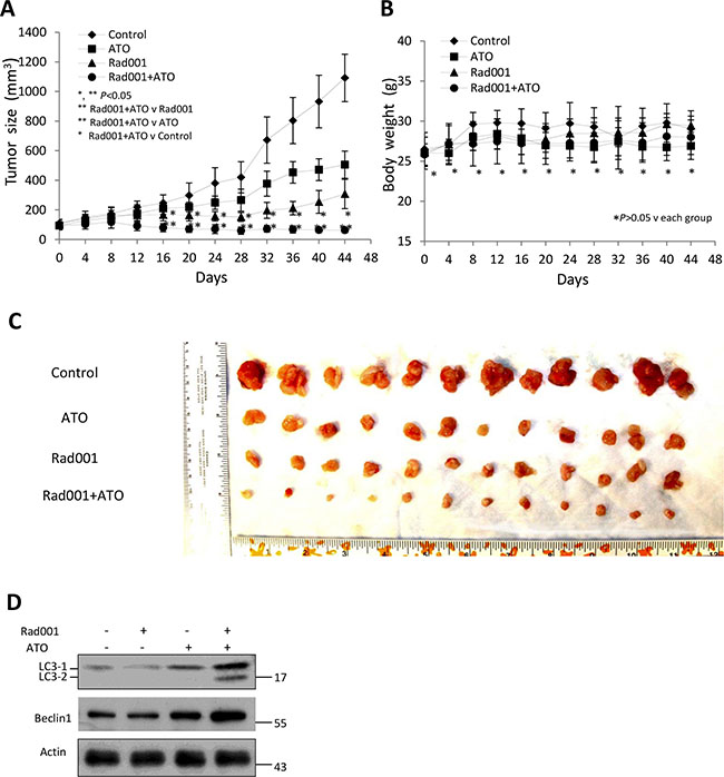Figure 7: Combination of Rad001 and ATO can significantly inhibit the growth of prostate cancer LNCaP cells xenograft in a mouse model. (A) Anti-tumor activity on LNCaP xenografts by various compounds. Mice were administered daily i.p. with Rad001 at 1 mg/kg, ATO at 2 mg/kg, and both daily (6 mice/group). The tumor sizes were measured every four days. (*P < 0.05 compared with untreated animals. **P < 0.05 compared with RAD001-treated animals or ATO-treated animals). (B) The mice weights were measured every four days (*P > 0.05 compared with untreated animals. **P > 0.05 compared with RAD001-treated animals or ATO-treated animals). (C) Tumors treated with two compounds were much smaller than single compound treatment or control. The LNCaP xenograft tumors were dissected after 44 days. (D) Immunoblot analysis for LC3 and Beclin1 from the lysate prepared from the xenograft.