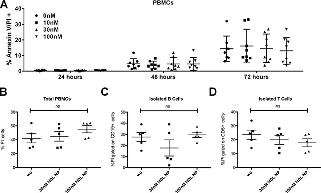 In order to determine the potential toxicity to healthy cells, total PBMCs were incubated with HDL NPs. In a cohort of healthy volunteers in the United States (USA), no significant difference in apoptosis was demonstrated in total PBMCs when treated with 10, 30, or 100 nM HDL NP for 24, 48, or 72 hrs (Figure 2A). Similar data were collected in samples from healthy volunteers in Italy, and showed that HDL NP were not toxic to PBMCs (Figure 2B), B cells (Figure 2C), or T cells (Figure 2D).