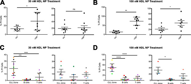 We hypothesized that CLL cells express SR-B1 and that the HDL NP would produce a therapeutic response in primary cells isolated from patients with CLL. To test this hypothesis we first investigated SR-B1 expression in healthy peripheral blood mononuclear cells (PBMCs) and CLL cells collected from patients. We treated normal PBMCs from healthy individuals and CLL cells obtained from patients with HDL NPs and measured potential toxicity and therapeutic response, respectively. In short, our data demonstrate that, in contrast to normal B cells, CLL cells express SR-B1 and the HDL NPs potently induce apoptosis in primary CLL cells.