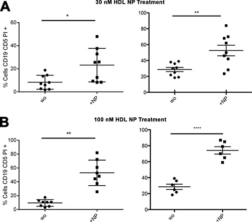 To further investigate specific killing of CLL cells, we evaluated the effect of the HDL NP (30 nM and 100 nM) on CLL cells isolated from the PBMCs. A dose-dependent pro-apoptotic effect was measured at 72 hours in samples treated at 30 nM (Figure 5A) and 100 nM HDL NP (Figure 5B) in both patient cohorts as compared to untreated controls.