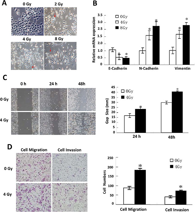 Figure 1: EMT phenotypes displaying. (A) Representative morphological changes in IR-treated Eca109 cells. (B) Relative mRNA expression of the EMT biomarkers: E-cadherin, N-cadherin and vimentin detected by quantitative PCR under different doses of IR treatment. (C) Scratch assay detection of cells’ invasiveness under different doses of IR treatment (left), and their quantitative analysis (right). (D) Transwell invasion assay detection of cells’ migration and invasion ability (left), and their quantitative analysis (right).