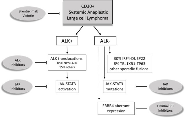 The study by Crescenzo et al. further depicted the heterogeneity of ALK negative ALCL by the recognition of numerous sporadic fusion transcripts [71]. As a common feature, chimeric proteins recurrently involved tyrosine kinases (i.e. ROS1 or TYK2) triggering the activation of JAK/STAT3 pathway. Interestingly, these gene fusions were mutually exclusive with JAK1/STAT3 mutations, suggesting convergent pathogenetic mechanisms and therapeutic targets for ALK negative ALCL (Figure 1).