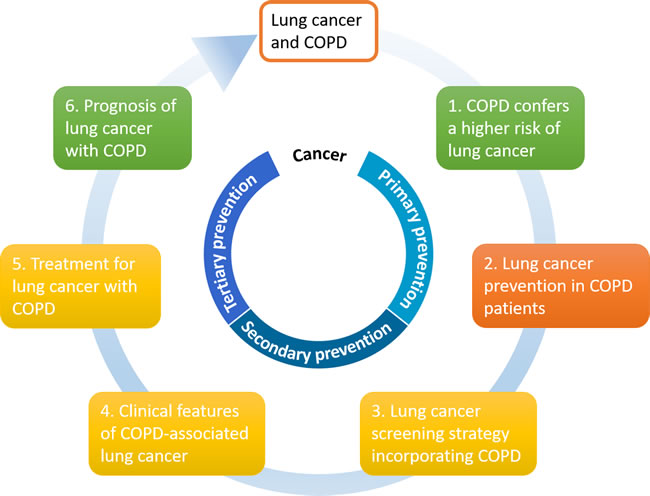 Lung cancer prevention strategies should be emphasized and encouraged throughout the entire disease process. Primary prevention is aimed at limiting the incidence of lung cancer. COPD, characterized as either airflow obstruction or emphysema, is an important predisposing factor for lung cancer development. Thus, a primary aim is to control the additional exposures (such as smoking and SHS exposure) which contribute to COPD, lung cancer, and the progression from COPD to lung cancer. The use of chemopreventive agents such as ICS and statin remain relatively rudimentary in COPD patients, and should be tested in prospective, controlled trials. Secondary prevention refers to the early detection of lung cancer at a pre-clinical phase, and lung cancer screening represents the most important component of this approach. The current available evidence shows that lung cancer screening in COPD patients confers a high detection rate of cancer at early stage (stage shift), and reduces lung cancer mortality. Nevertheless, some screening-related issues (e.g., underdiagnosis of COPD and potential benefit offset) ought to be recognized and discussed in the future. With respect to clinical features, lung cancer in COPD is quite distinct from that in non-COPD, highlighting the demand for a designated screening criteria as well as a tailored treatment algorithm in this patient population. Tertiary prevention points to the execution of treatment and rehabilitation with the principal aim of alleviating disability and improving the outcomes of illness. Surgery for lung cancer in COPD may have a lung volume reduction effect. Precise risk assessment, optimal preoperative management (smoking cessation, medical treatment for COPD, and pulmonary rehabilitation), and MDT care are critically important before surgery. Meanwhile, the recognition of the effect of COPD on lung cancer prognosis enables refined prognostication and thus allows for personalised clinical decision-making. Increasing understanding of the relationship between COPD and lung cancer will allow the development of better cancer preventive strategies and ultimately will improve the outcomes of this patient population.