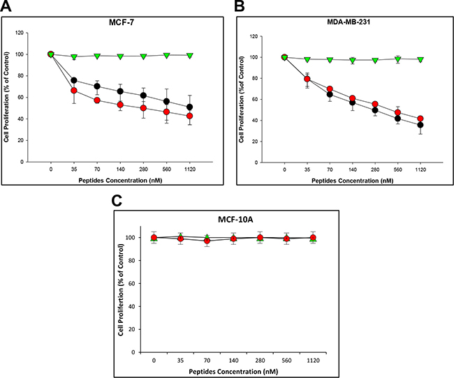 Figure 1: SMRwt peptide antagonists inhibit proliferation of MCF-7 and MDA-MB-231 breast cancer cells but not non-tumorigenic cells. Cells were incubated with peptides at varying dosage (0–1120 nM) for 24 hr, after which proliferation was measured by MTT assay. Results of three independent experiments are shown. (A) Proliferation of MCF-7 breast cancer cells. (B) Proliferation of MDA-MB-231 breast cancer cells. (C) Proliferation of non-tumorigenic MCF-10A cells. Red dots indicate PEG-SMRwt peptide, black dots indicate PEG-SMRwt-CLU peptide, and green triangles indicate PEG-SMRmut peptide.