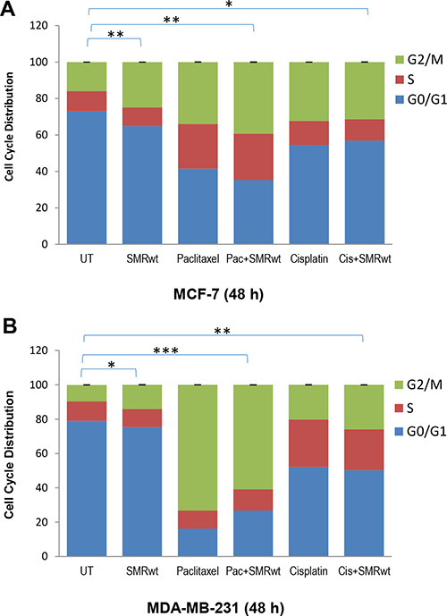 Figure 2: PEG-SMRwt-CLU peptide antagonist and chemotherapeutics induced cell cycle arrest in MCF-7 and MDA-MB-231 breast cancer cells. Cells were treated 48 hr with SMR peptides, alone or in combination with paclitaxel or cisplatin, and were assayed by Cellometer imaging cytometry, indicating percentage of MCF-7 (A) and MDA-MB-231 (B) in various cell cycle phases. Results of two independent experiments are shown. Significant differences relative to untreated control are indicated as follows: *p < 0.01, **p < 0.001 for MCF-7 cells, and *p < 0.02, **p < 0.01, ***p < 0.0001 for MDA-MB-231 cells.