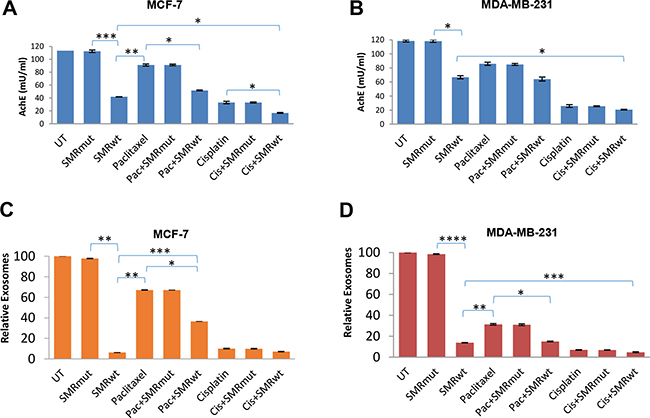 Figure 4:PEG-SMRwt-CLU peptide antagonist blocks exosome release from MCF-7 and MDA-MB-231cells. Cells were treated for 48 hr with peptide alone or combined with paclitaxel or cisplatin. (A, B) Relative level of exosomes released from MCF-7 and MDA-MB-231 cells respectively, determined by AchE assay. Error bars represent mean ± SD of four independent experiments. Significant differences relative to SMRwt peptide: *p < 0.01, **p < 0.001, ***p < 0.0001 for MCF-7 cells; and *p < 0.01 for MDA-MB-231 cells. (C, D) Relative numbers of exosomes released by MCF-7 and MDA-MB-231 cells respectively, as determined by Nanosight measurement. Error bars represent mean ± SD of two independent experiments. Significant differences relative to SMRwt peptide: *p < 0.01, **p < 0.001, ***p < 0.0001 for MCF-7 cells and *p < 0.03, **p < 0.02, ***p < 0.01 and ****p < 0.001 on MDA-MB-231 cells.