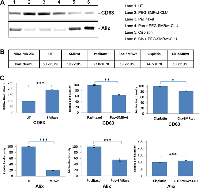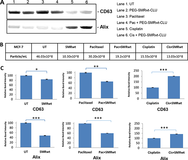 Figure 5: Exosome-specific proteins can be detected on exosomes from MCF-7 breast cancer cells. Cells were treated for 48 hr with SMRwt peptide alone or combined with paclitaxel or cisplatin. (A) Expression of exosome proteins by Western blot analysis and (B) Exosome numbers were measured by NanoSight and (C) Densitometry analysis showing relative intensity of bands. Data represent the mean ± SD of three independent experiments. Significant differences relative to treatment with peptide are indicated as follows: *p < 0.01, **p < 0.001, ***p < 0.0001.
