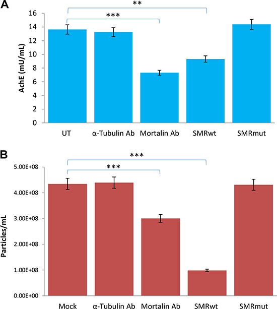 Figure 7: Antibody to mortalin inhibits exosome secretion from MCF-7 breast cancer cells. MCF-7 cells were either transfected with antibodies to mortalin or alpha-tubulin, or treated with SMRwt or SMRmut peptides. (A) Relative exosome release level after 48 hr by AchE assay. (B) Relative numbers of exosomes released after 48 hr by NanoSight analysis. Error bars represent the mean ± SD of three independent experiments. Significant differences relative to untreated cells: *p < 0.0001, **p < 0.0001.