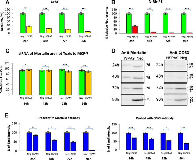 Figure 8: Exosome secretion is decreased in MCF-7 breast cancer cells by knockdown of mortalin expression. MCF-7 cells were transfected with clones expressing siRNA against either mortalin (HSPA9) or a negative control RNA. Exosomes were isolated and analyzed after 24, 48, 72, and 96 hr for changes in (A) level of exosome secretion by AchE assay. Significant differences relative to controls are indicated: ***p < 0.0001 (B) exosome secretion by N-Rh-PE. Significant differences relative to controls are indicated: ***p < 0.0001, (C) percentage of live cells remaining at each time point, *p < 0.05, **p < 0.002, ***p < 0.0001 (D) mortalin and CD63 protein expression levels by Western blotting. (E) Densitometry analysis of Western blot data. Significant differences relative to controls are indicated: *p < 0.01, **p < 0.001, ***p < 0.0001.