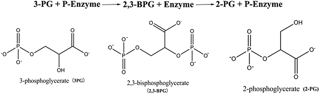 Figure 1: The phosphoglycerate mutase reaction and the chemical structural formula of 3PG, 2,3-BPG, and 2PG.