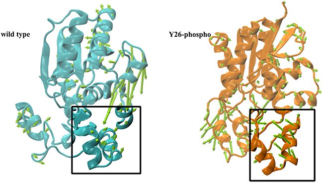 In the present paper, we used molecular dynamics (MD) simulation to test the hypothesis that Y26-phosphorylation enhances the activity of PGAM1 and to learn how the enhancement is achieved. MD simulation is a computational method for studying the physical movements of atoms and molecules, which are allowed to interact for a fixed period of time, giving a dynamical evolution of the system [11–14]. It is very useful in exploring enzyme-substrate interactions [15].