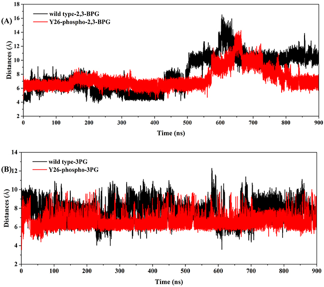 Non-bonded interactions such as hydrogen bond, hydrophobic interaction, salt bridge play important roles in macromolecules’ structural formation and biological functions. We examined the formation of hydrogen bonds between 2,3-BPG and its surrounding residues of PGAM1 over the 900 ns simulation for both the wild type system and the Y26-phospho system, with the results presented in Table 1 and Figure 3. Hydrogen bond formation was based on the two criteria presented in the Method section. We found that the wild type and Y26-phospho systems had 18 and 33 hydrogen bonds formed, respectively. That is, 2,3-BPG molecule in the Y26-phospho system formed more hydrogen bonds than in the wild type system. More importantly, the hydrogen bonds persisted much longer in the Y26-phospho system than in the wild type system, indicating that PGAM1 phos interacts more actively with 2,3-BPG, than PGAM1 wt interacts with 2,3-BPG.