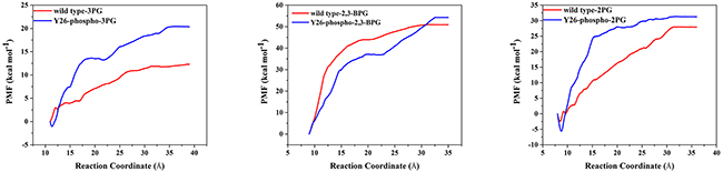 Figure 9: The PMF of pulling 3PG, 2,3-BPG, and 2PG from PGAM1. Red and blue lines are for the wild type and Y26-phospho systems, respectively.