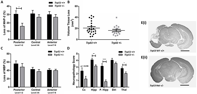Figure 1: Brain injury assessment of Trp53 WT (+/+) and Het (+/-) mice 7 days following 50 min HI at PND 9. MAP-2 tissue loss A. volume tissue loss B. MBP loss C. and neuropathology scores D. were assessed at 8 levels of the brain in Trp53 WT (black bars; n=21) and Trp53 het (grey bars; n=16). MAP-2 stained images at posterior levels of the brain from Trp53 WT +/+ E(i). and Trp53 het +/- E(ii). Mean ± SEM. * p< 0.05, ** p < 0.01, **** p<0.0001. Cortex (Cx), Hippocampus (Hipp), posterior hippocampus (P. Hipp), Striatum (Stri), Thalamus (Thal). Scale bar represents 2 mm.
