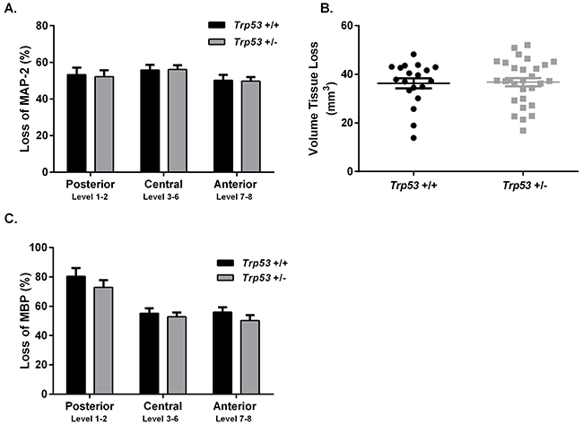 Figure 2: Brain injury assessment of Trp53 WT (+/+) and Het (+/-) mice 7 days following 60 min HI at P9. MAP-2 tissue loss A. volume tissue loss B. and MBP loss C. were assessed at 8 levels of the brain in Trp53 WT (black bars; n=20) and Trp53 het (grey bars; n=29). Mean ± SEM.