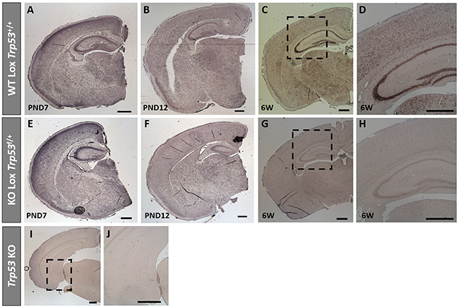 Figure 4: Trp53 in situ hybridization on brains from WT Lox Trp53+/+, KO Lox Trp53f/+ and Trp53 KO. In situ hybridization of Trp53 in WT Lox Trp53+/+ A-D. KO Lox Trp53f/+ E-H. and traditional Trp53 KO I, J. at postnatal day (PND) 7 A, E. PND 12 B, F. 6 weeks of age C, G. and [higher magnification D, H.]. Traditional Trp53 KO I. higher magnification J. shows no Trp53 staining. Scale bars represent 500 μm.