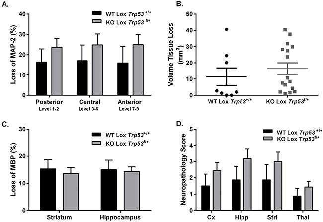 Figure 5: Brain injury assessment of WT Lox Trp53+/+ and KO Lox Trp53f/+ mice 7 days following 40 min HI at PND 28. MAP-2 tissue loss A. volume tissue loss B. MBP loss C. and neuropathology score D. were assessed in WT Lox Trp53+/+ (black bars; n=8) and KO Lox Trp53f/+ (grey bars; n=16). Mean ± SEM. Cortex (Cx), Hippocampus (Hipp), Striatum (Stri), Thalamus (Thal).