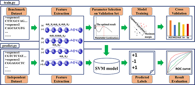 The aforementioned algorithms contain some uncertain parameters, such as k, λ, and w. All these parameters are automatically determined by train.py in processing the benchmark dataset submitted by users. The concrete process is to optimize the following five commonly used success scores: (1) accuracy (Acc), (2) Mathew’s Correlation Coefficient (MCC), (3) sensitivity (Sn), (4) specificity (Sp), and (5) area under ROC curve (AUC). As for their rigorous definitions and intuitive formulations, see [21, 23, 24, 35, 38, 60]. Furthermore, the corresponding ROC (receiver operating characteristic) [68] curve is also provided and saved in a PNG file. Finally, by optimizing these scores with respect to all possible parameters, the corresponding best model will be generated.