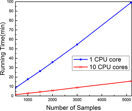 The computational speed in optimizing many different parameters is a bottleneck for the efficiency of the Pse-Analysis platform. In this regard, the multiprocessing technique has been applied to significantly speed up the computational processes. It has been shown when dealing with the above case that the computing time for the parameter optimization process can be reduced by 6 folds when using 10 cores instead of a single core, as shown in Figure 2.