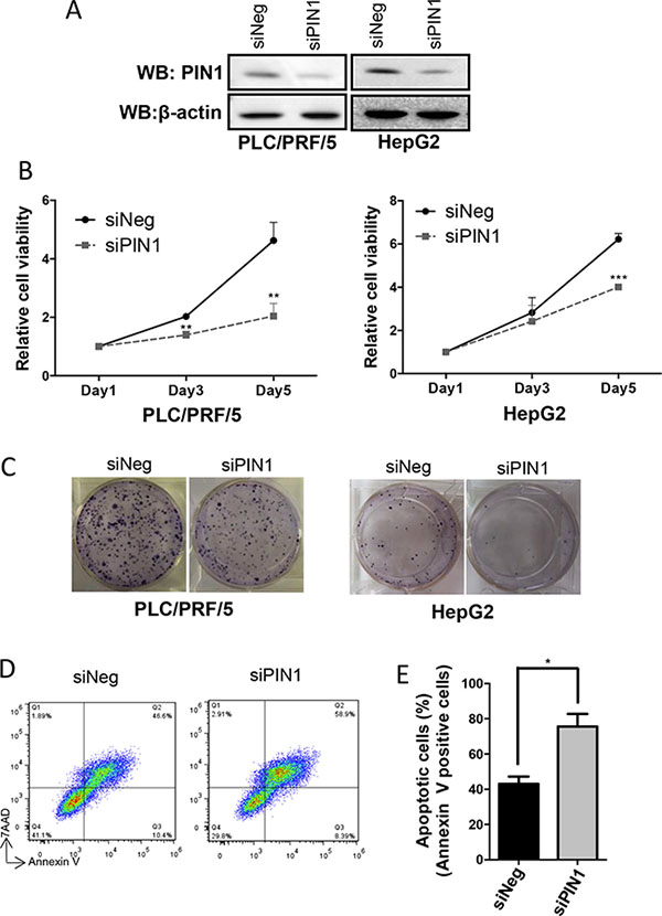 Figure 1: Down-regulation of PIN1 suppressed cell proliferation and colony formation, and enhanced apoptosis of HCC cell lines. (A) Western immunoblots showing down-regulation of PIN1 by siRNA in HepG2 and PLC/PRF/5. β-actin was used as an internal control. (B) PIN1 knock-down by siRNA suppressed proliferation of HepG2 and PLC/PRF/5 cells as shown by MTT assay. (**P ≤ 0.01, and ***P ≤ 0.001, paired t-test) (C) In-vitro assay showing significant suppression of colony formation by HepG2 and PLC/PRF/5 cells after PIN1 knocked-down. (D) FACS analysis scatter plots showing the increase in apoptosis of PLC/PRF/5 cells (positive staining for annexin-V) after PIN1 knocked-down. (E) Diagram illustrating the significant increase in apoptotic cells after PIN1 knocked-down in PLC/PRF/5. Three independent sets of experiments were performed. (*P ≤ 0.05, paired t-test).
