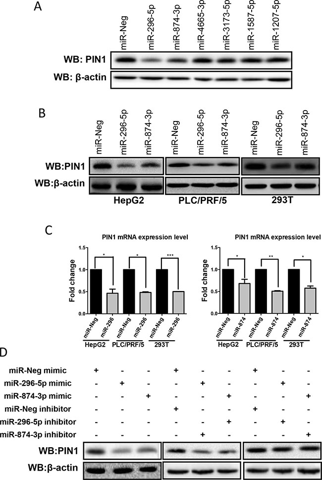 Figure 2: Over-expression of miR-296-5p and miR-874-3p decreased PIN1 mRNA and protein expression levels. (A) Of the 6 miRNAs tested, only miR-296-5p and miR-874-3p suppressed PIN1 expression in HepG2 cells as examined with western immunoblot. (B) Western blot showing PIN1 down-regulation in all 3 cell lines transfected with miR-296-5p and miR-874-3p (C) PIN1 mRNA was suppressed by miR-296-5p (left panel) and miR-874-3p (right panel) as determined by RT-qPCR. (*P ≤ 0.05, **P ≤ 0.01, and ***P ≤ 0.001, paired t-test) (D) Western blots showing that miR-296-5p and miR-874-3p inhibitors abolished the PIN1 regulation induced by their corresponding miRNAs.
