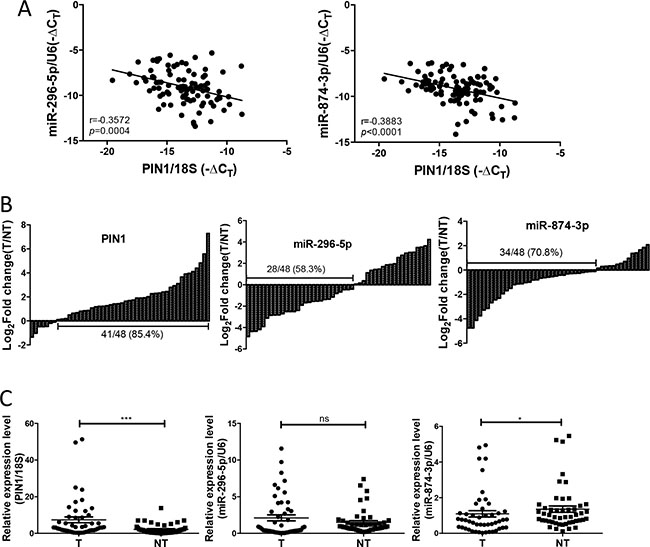 Figure 3: The expression of miR-874-3p was down-regulated in primary HCC tissues and correlated negatively with PIN1. (A) The expression of PIN1 was negatively correlated with miR-296-5p (left) and miR-874-3p (right) (B) The expression of PIN1 (left panel), miR-296-5p (middle panel) and miR-874-3p (right panel) for each paired sample was represented as log2 fold change of the tumour relative to the non-tumourous tissue (T/NT). (C) The relative expression of miR-296-5p, miR874-3p and PIN1 in tumour (T) and non-tumourous tissue (NT) were shown by scatter plot. (*P ≤ 0.05, and ***P ≤ 0.001; ns = no significance, Mann Whitney test).
