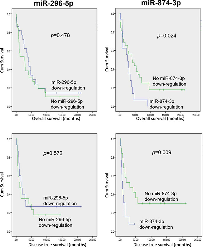Figure 4: HCC patients with miR-874-3p down-regulation showed inferior overall and disease-free survivals. Kaplan-Meier survival curves showing that HCC patients with down-regulation of miR-874-3p (right panels), but not miR-296-5p (left panels), exhibited lower overall (upper panels) and disease-free (lower panels) survival rates. P values were shown in the figure.