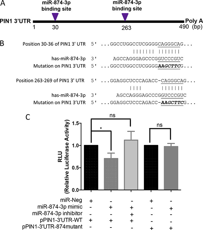 Direct binding of miR-874-3p to 3′UTR of PIN1 mRNA