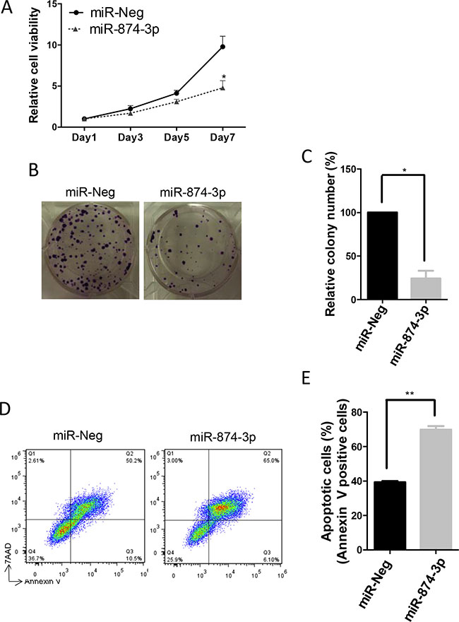 Decrease in cell proliferation and in-vitro Experiments were repeated in triplicate scolony formation, and increase in apoptosis mediated by miR-874-3p in HCC