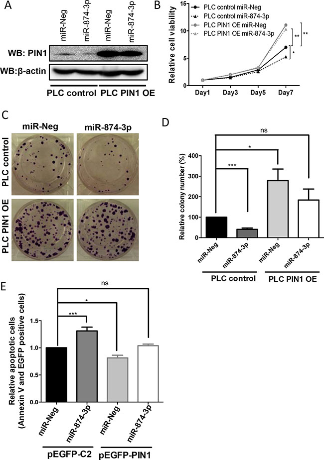 Figure 7: miR-874-3p regulated cell proliferation, colony formation as well as cellular apoptosis via down-regulation of PIN1 expression. (A) Western blots showing the high level of PIN1 in PLC/PRF/5 cells stably transfected with PIN1 cDNA (PLC PIN1 OE) irrespective of miR-874-3p expression. (B) PIN1 over-expression abolished the suppressed cell proliferation mediated by miR-874-3p. (*P ≤ 0.05, **P ≤ 0.01, unpaired t-test) (C) PIN1 over-expression abrogated the suppressed colony formation mediated by miR-874-3p. (D) Diagram showing PIN1 over-expression ameliorated the inhibition of colony formation of PLC/PRF/5 cells by miR-874-3p. (**P ≤ 0.05, ***P ≤ 0.001 , ns = no significance, unpaired t-test) (E) Diagram showing PIN1 over-expression suppressed the enhancement of cellular apoptosis mediated by miR-874-3p. (*P ≤ 0.05, ***P ≤ 0.001, ns = no significance, unpaired t-test).