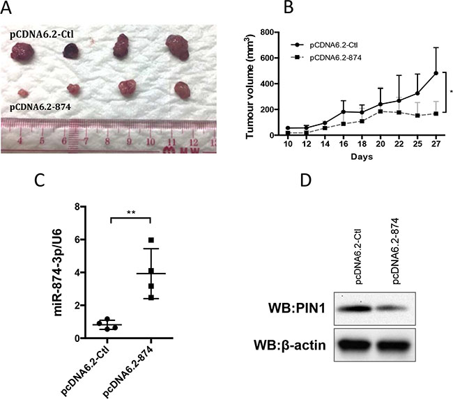 Figure 8: Expression of miR-874-3p suppressed HCC tumour growth in vivo. (A) 2 × 106 PLC/PRF/5 cells with control sequence (pCDNA6.2-Ctl) or miR-874-3p (pCDNA6.2-874) over-expression were subcutaneously injected in the left flank and right flank of nude mice respectively. Tumour development was monitored for 28 days after injection. The size of tumours developed from miR-874-3p expressing cells was smaller than those of the control cells. (B) The development of tumours from miR-874-3p expressing cells was significantly slower. (C) RT-qPCR showing the higher miR-874-3p expression in the tumours derived from miR-874-3p expressing cells. (D.) Western blot showing the lower expression of PIN1 in one of the representative tumours derived from miR-874-3p expressing cells. (*P ≤ 0.05, **P ≤ 0.01, paired t-test).