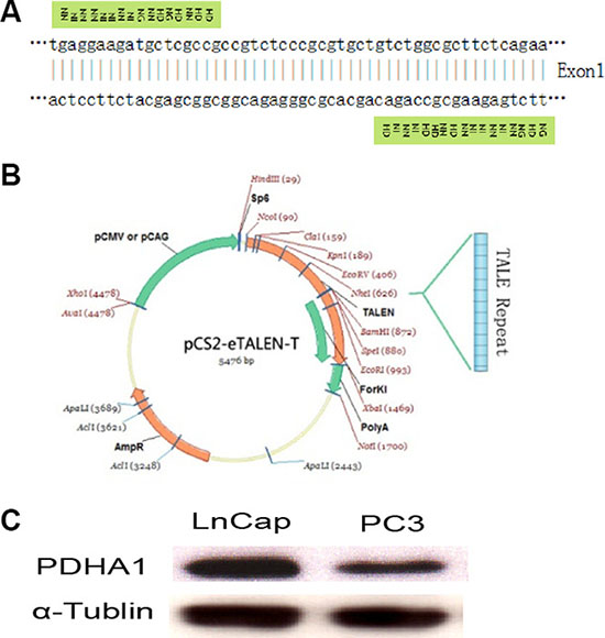 Figure 1: TALEN construction and cell line selection. Targeting sequence of PDHA1 gene for TALEN mediated knockout (A), TALEN plasmid structure (B) and PDHA1 expression in prostatic cancer cell lines LnCap and PC3 (C) are shown.