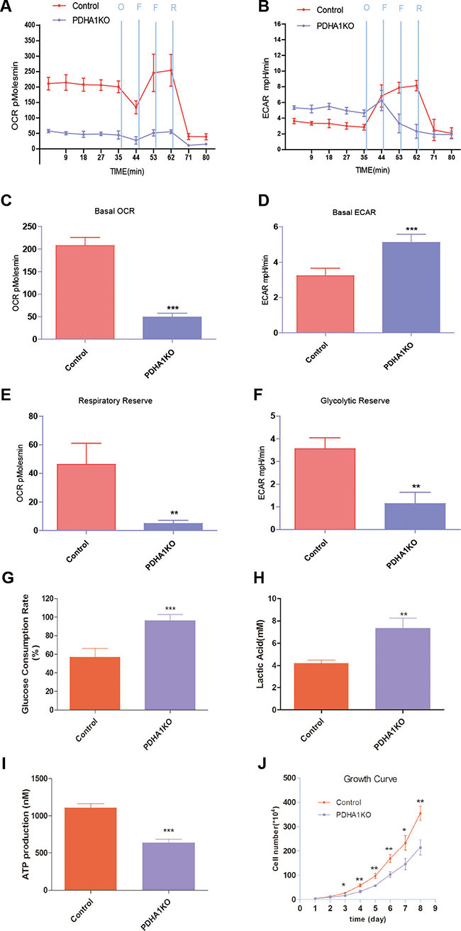 Figure 3: Mitochondrial respiratory profile of the cells. (A) OCR measurements were obtained over time (min) using an extracellular flux analyzer. The mitochondrial stress test was used to obtain bioenergetics parameters, by adding Oligomycin (O, 1 mM), FCCP (F, 400 nM) (two times use of FCCP) and Reteno (R, 1 mM). (B) ECAR measurements were obtained as the above method. (C) Basal OCR. (D) Basal ECAR. (E) The respiratory reserve capacity was calculated as the difference between basal and maximal, which was stimulated by FCCP. (F) The glycolytic reserve capacity was calculated as the difference between basal and maximal, which was obtained when oligomycin was added. (G) PDHA1KO cell consumed more glucose. (H) PDHA1KO cell excreted larger amount of extracellular lactate acid. (I) PDHA1KO cell produced less ATP. (J) PDHA1KO cell showed inhibited proliferation. **p < 0.01, ***p < 0.001, Three replicated experiments were carried out with the similar results.