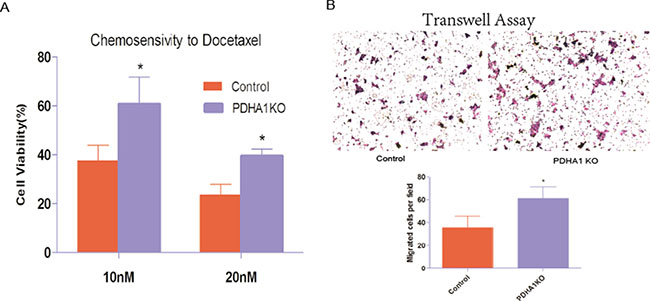 Figure 4: Chemotherapy sensitivity and migration ability. (A) PDHA1 gene knockout in the LnCap cells increased resistance to Docetaxel. All experiments were performed at least three times with consistent and repeatable results.* vs control p < 0.05. (B) Stable knockout of PDHA1 promoted migration of LnCap cell.