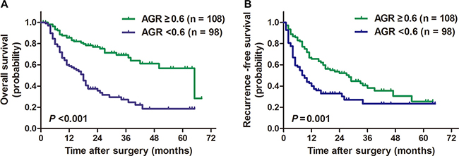 AGR less than 0.6 was associated with significant poor prognosis in terms of OS and RFS (P < 0.001 for OS; P = 0.001 for RFS; Figure 1). The 1-, 3- and 5-year OS rates for low-risk AGR group and high-risk AGR group were 85.4%, 69.0%, 56.1% and 59.7%, 26.9% , 18.1%, respectively. The 1-, 3- and 5-year RFS rates for low-risk AGR group and high-risk AGR group were 66.6%, 37.9%, 25.3% and 42.5%, 22.9%, 22.9%, respectively.