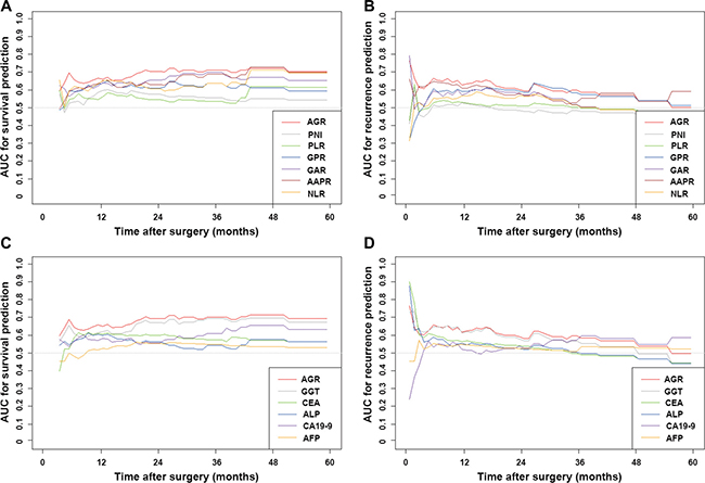 Figure 2: The time-dependent ROC curves of AGR, other inflammation-based scores and conventional blood parameters in death (A and C) and recurrence (B and D) prediction. Compared with other inflammation-based scores and serological tumor markers, the AUROC of AGR was the highest for death and recurrence prediction for the most of the follow-up time.