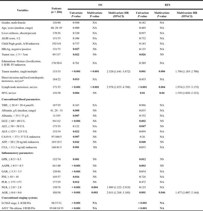 Abbreviations: OS, overall survival; RFS, recurrence-free survival; HBsAg, hepatitis B surface antigen; ALBI, albumin-bilirubin; MVI, microvascular invasion; TBIL, total bilirubin; ALT, alanine transaminase; GGT, gamma-glutamyltransferase; ALP, alkaline phosphatase; AFP, Alpha-fetoprotein; CEA, carcinoembryonic antigen; GPR, gamma-glutamyltransferase to platelet ratio; AAPR, albumin to alkaline phosphatase ratio; GAR, gamma-glutamyltransferase to alanine aminotransferase ratio; PNI, the prognostic nutritional index; PLR, platelet to lymphocyte ratio; NLR, neutrophil-to-lymphocyte ratio; AGR, albumin to gamma-glutamyltransferase ratio. *Direct invasion and local extrahepatic metastasis, included invasion of gallbladder, adrenal gland and diaphragm; LCSGJ, the Liver Cancer Study Group of Japan; AJCC, American Joint Committee on Cancer; P-value < 0.05 marked in bold font shows statistical significant.