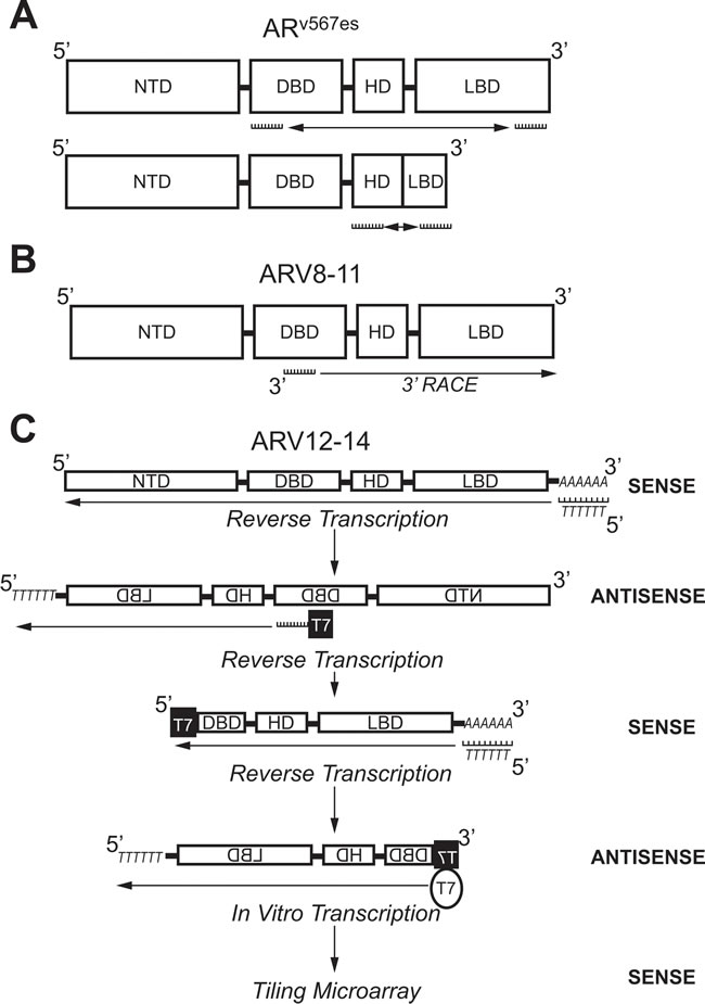 Figure 4: Molecular biology methods used to identify androgen receptor splice variants ARv567es, ARV8-11, and ARV12-14. A. Primers against the coding region for the DBD (Exon 2) and LBD (Exon 8) were used to amplify ARv567es using PCR. Confirmation of exon-skipping was done using PCR with primers against coding regions for the HD (Exon 4) and LBD (Exon 8). B. A primer against the coding region for the DBD (Exon 2/3) was used in 3’-RACE to identify ARV8-11. C. Selective linear amplification of sense RNA (SLASR) was used to identify ARV12-14. After reverse transcription using an oligo-dT primer, reverse transcription was repeated with a primer against the coding region for the DBD (Exon 3) containing the T7 RNA polymerase consensus sequence. A third round of reverse transcription was then performed using an oligo-dT primer. Finally, T7 RNA polymerase was used to amplify DBD-containing transcripts and a tiling microarray performed to identify ARV12-14. AR: Androgen receptor; ARV: Androgen receptor splice variant; DBD: DNA-binding domain; NTD: N-terminal domain; HD: Hinge domain; LBD: Ligand binding domain; RACE: Rapid amplification of DNA ends; SLASR: Selective linear amplification of sense RNA.