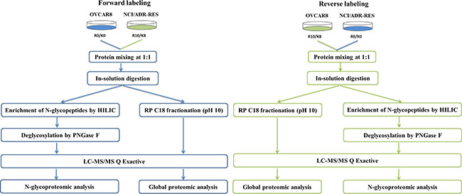 Figure 1: Workflow for the integrated analysis of global protein expression and glycosite-containing peptides. In forward labeling experiments, equal amounts of protein obtained from “heavy labeled” NCI/ADR-RES and “light labeled” OVCAR8 cells were combined and followed by in-solution tryptic digestion. Mixed labeled peptide samples were then separated into two aliquots. One aliquot was enriched for glycosite-containing peptides using HILIC and the other aliquot was used for high pH reverse phase C18 fractionation followed by the analysis of global protein expression. Finally, LC-MS/MS analysis of peptides were performed using a LC-MS/MS system. In reverse labeling experiments, “heavy labeled” OVCAR8 and “light labeled” NCI/ADR-RES cells were treated in parallel using procedures same to those described above. Forward labeling and reverse labeling experiments were conducted twice using independent biological replicates.