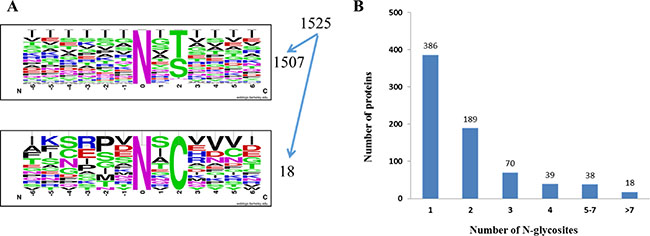 Figure 2: OVCAR8 and NCI/ADR-RES cells N-glycosites identified. (A) Motif analysis of 1525 class Ι glycosites identified. (B) Number of N-glycosylation sites identified per protein.
