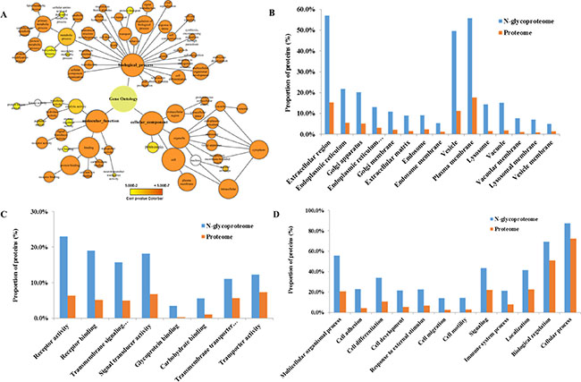 Figure 3: Gene ontology analysis. (A) GOSlim Generic assignment provided an initial overview of the GO distribution. (B) Cellular components are significantly overrepresented in the N-glycoproteome compared to the entire human proteome. (C) Molecular functions that are significantly overrepresented in the N-glycoproteome compared to the entire human proteome. (D) Biological processes that are significantly overrepresented in the N-glycoproteome compared to the entire human proteome.