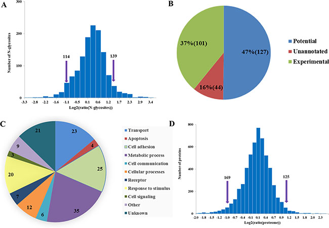 Figure 4: Comparative analyses of N-glycosylation level and proteome between NCI/ADR-RES and OVCAR8 cells. (A) Log2 ratio distributions for N-glycosites analyzed, note that greater than 1 or less than −1 were considered significant. (B) Significantly changed N-glycosites (253) match to Uniprot database annotations. (C) Functional annotation of glycoproteins with significantly changed N-glycosite-containing peptides. (D) Log2 ratio distributions for proteome analyzed, note that greater than 1 or less than −1 were considered significant.